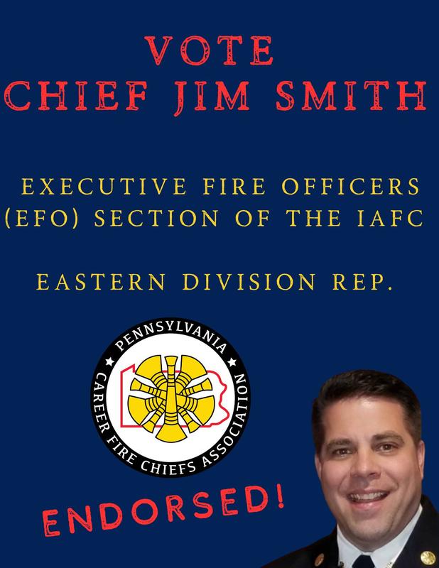 | The Pennsylvania Association of Career Fire Chiefs (PACFCA) proudly announces its unanimous endorsement of Fire Chief Jim Smith for the position of EFO Section Representative for the Eastern Division of the International Association of Fire Chiefs